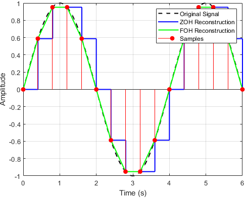 Figure 1 illustrates the discontinuous, piecewise-constant nature of the Zero-Order Hold (ZOH) output contrasted with the continuous, linearly interpolated response of the First-Order Hold (FOH), highlighting their respective influences on signal reconstruction fidelity and smoothness.