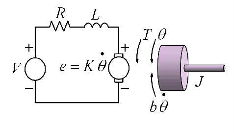 J is the motor inertia, b is the damping coefficient, K is the motor constant, θ(t) is the angular position of the motor, V(t) is the input voltage (control input u(t)).