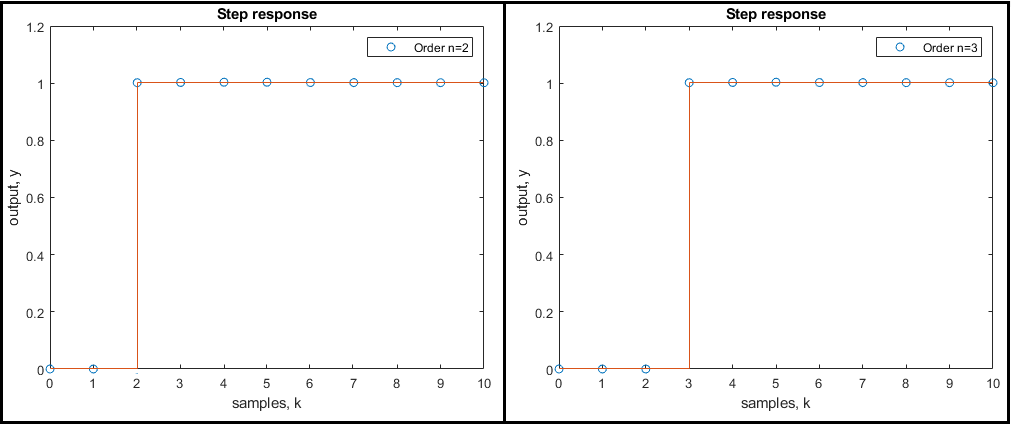 Placing 𝑛 poles at 𝑧 = 0 introduces 𝑛 dynamic modes, each of which decays in one sample. Therefore, the system output remains zero until sample 𝑘 = 𝑛, at which point it jumps to the final value and remains there.