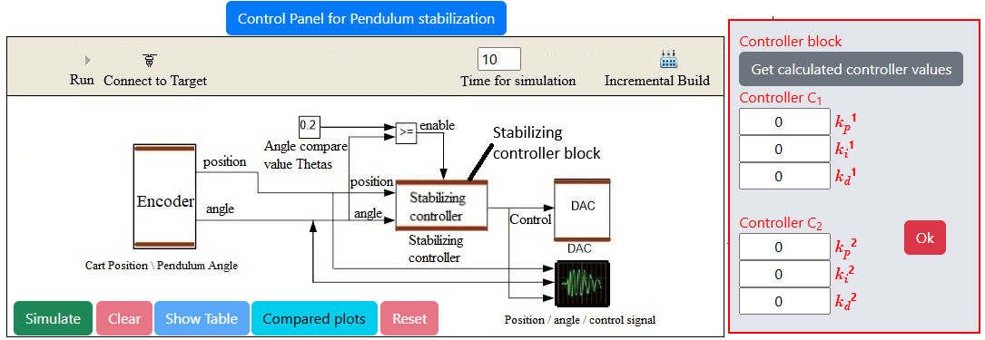 - Click on "Stabilizing controller" block in the control panel, click on 'Get calculated controller values' button. The controller values will be visible in respective boxes in controller block.