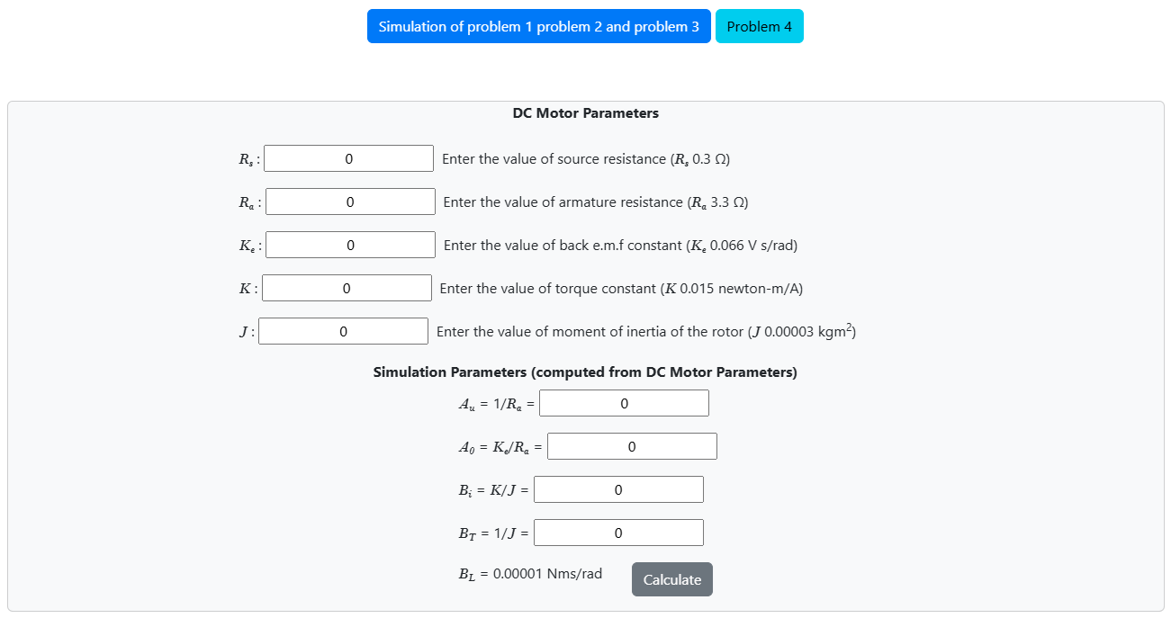 - Click on 'Calculate' button to calculate the values of simulation parameters Au, A0, Bi, BT. BL is taken as 0.00001 Nms/rad.