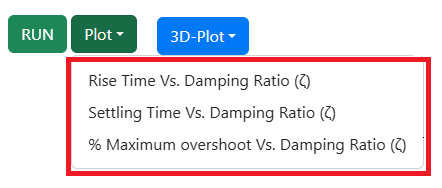 - Click on 'Plot' button then on 'Rise Time Vs. Damping Ratio (ζ)' to observe the Rise Time Vs. Damping Ratio (ζ) plot for all ζ values chosen where 0.4 ≤ ζ ≤ 1.