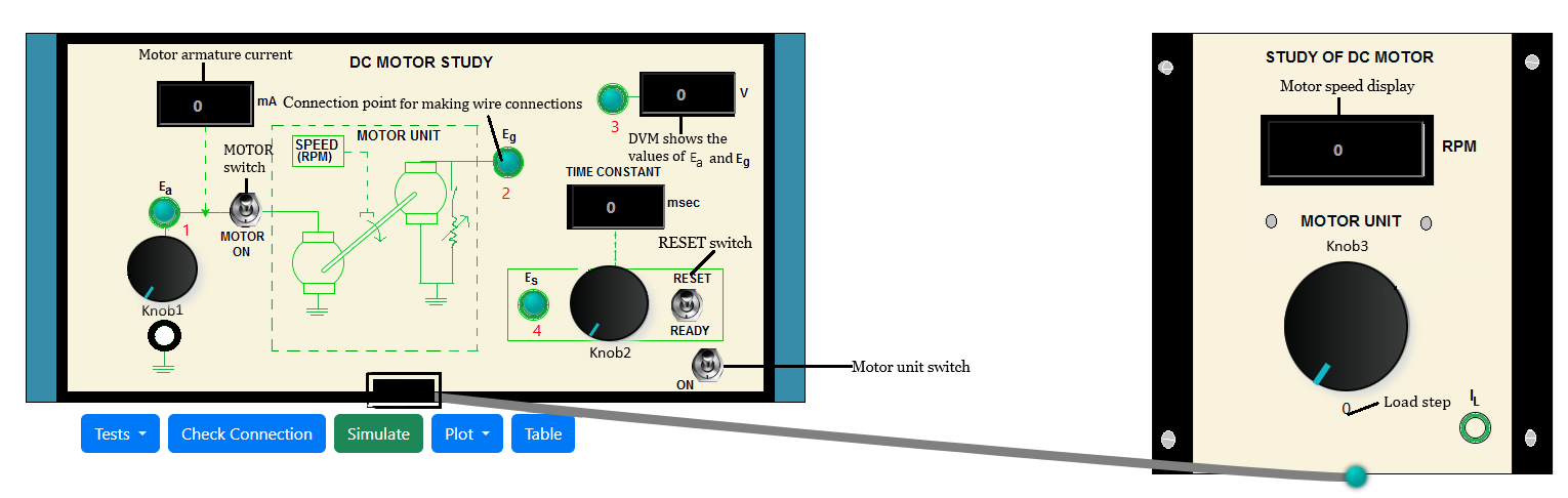 - Apply armature voltage Ea through knob1 and set Ea to 8 volts. Click on 'Simulate' button.