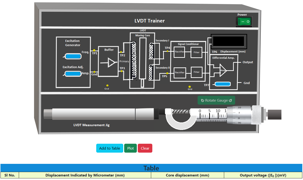 - Now move the core in the negative direction by clicking the anticlockwise arrow sign on 'Rotate Gauge' to obtain –2 mm displacement. Record the reading by clicking 'Add to Table'. Continue the same steps in –2 mm intervals until the display reaches –10 mm.