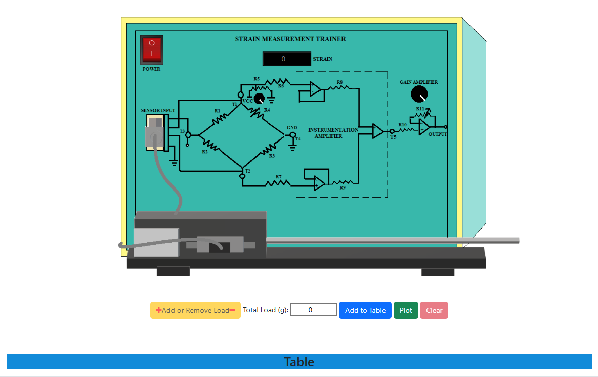 2. Upon clicking the 'Table' button situated at the bottom of the page, the observation table will show up. To observe the strain in the absence of any load, one must select the 'Add to Table' option. A non-zero value will be displayed as a result of the strain gauge's sensitivity.