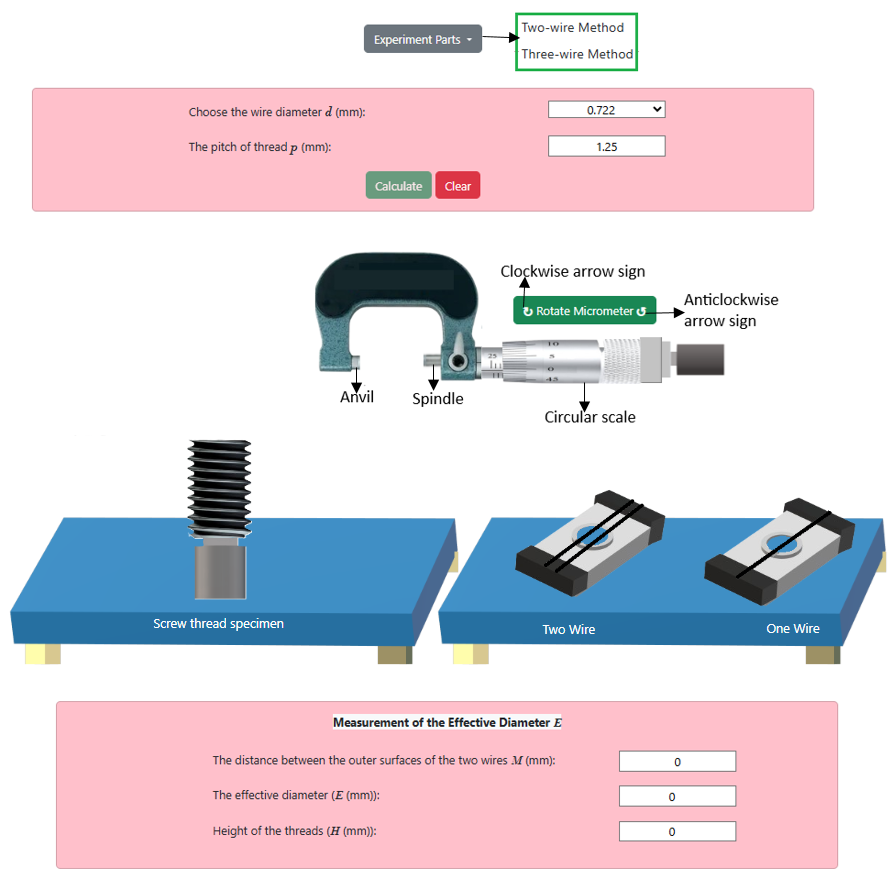 - Click on 'Calculate' button to find out the value of the effective diameter (E (mm)). Click on the anticlockwise arrow sign on the 'Rotate Micrometer' button to move the micrometer spindle from fixed position.